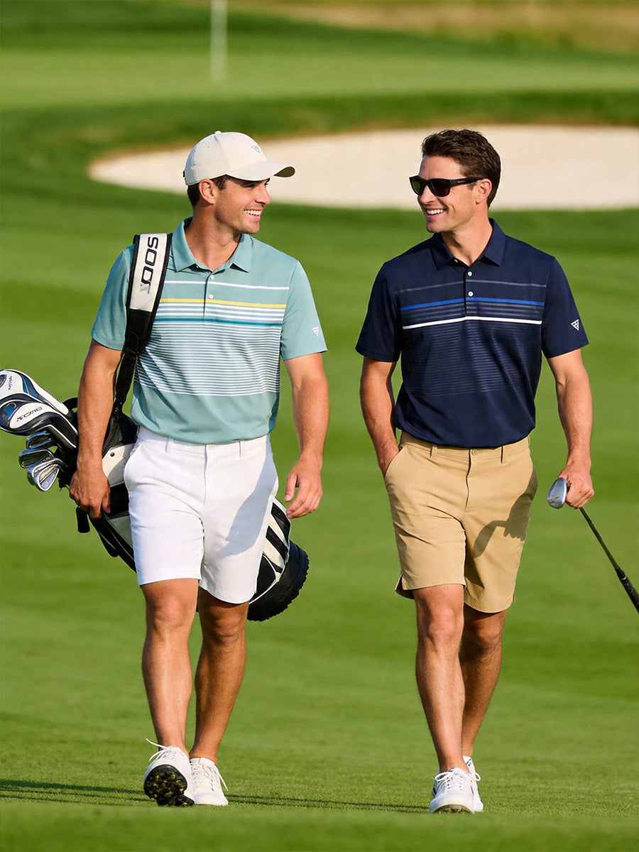 Presentamos nuestras "Camisetas tipo polo con estampado en el pecho" para hombre. Estas camisetas de golf están confeccionadas para el rendimiento con características de ajuste seco, transpirabilidad, absorción de humedad y secado rápido. El estiramiento en 4 direcciones y la protección UPF 50+ lo mantienen seco y fresco en el campo de golf, mejorando su rendimiento. Destaque con el diseño único de estampado de rayas coloridas en la parte delantera del pecho, agregando un toque de moda a estos elegantes polos de golf que muestran su estilo y temperamento.